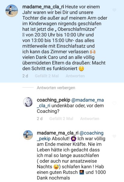 Heute schlafen wir Drei die Nächte bis auf ein bis zwei Unterbrechungen durch und unseren Haushalt können wir erledigen, wenn Mia ihre beiden Schläfchen am Morgen bzw. Nachmittag in ihrem Bettchen macht. Wir hätten uns nicht vorstellen können, dass das möglich ist. Dabei waren im Prinzip nur kleine Veränderungen nötig, die wir ohne größere Probleme und vor allem ohne „Schreien lassen“ umsetzen konnten. Währenddessen und auch nach dem Coaching konnten wir immer auf Carolins Hilfe und Unterstützung zählen.