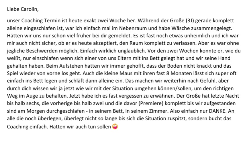 Ich kann allen Eltern von Kindern mit Schlafproblem nur empfehlen, sich an Carolin zu wenden. Ihre Unterstützung und Hilfe war wirklich Gold wert!